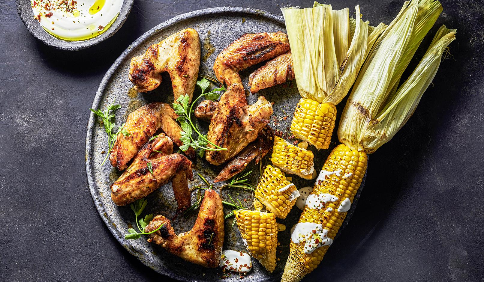 Rosmarinnadeln von den Stängeln zupfen, Knoblauch mit Messer oder Presse zerkleinern, beides mit Koriander, Paprika, Honig, einer guten Prise Salz und 3 EL Öl in einer Schüssel zu einer Marinade vermischen. Hähnchenflügel in die Marinade legen, 30 min im Kühlschrank ziehen lassen. Maiskolben im Heu 20 min auf kleiner Flamme in einem Topf mit Wasser köcheln lassen. Limettenschale abreiben und Limettensaft auspressen, mit dem Joghurt vermischen, mit Salz und Chili abschmecken. Grill oder Grillpfanne auf mittlere Stufe erhitzen, Hähnchenflügel ca. 20 min grillen. Dabei immer wieder wenden. Den Mais aus dem Heu schälen, mit Öl einpinseln, salzen und ebenfalls 10 min grillen. Hähnchenflügel mit Mais, Joghurt und der grob zerzupften Petersilie servieren.