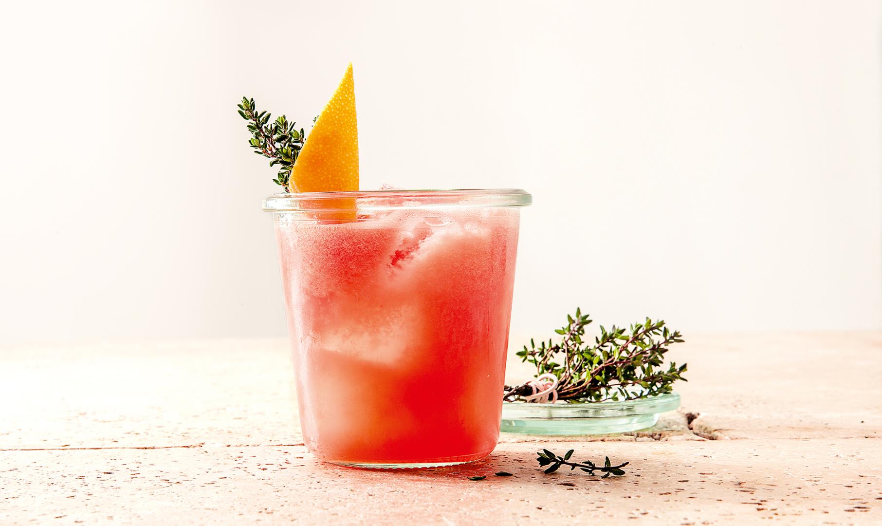 Alle Zutaten in einen Cocktailshaker geben und kräftig auf Eis shaken. Mit einem Sieb (Teesieb) in ein mit Eis gefülltes Glas abgießen und mit einem Thymianzweig garnieren. Alternativ für Personen ohne Cocktailshaker im Haushalt: Zuckersirup ersetzen durch einen selbstgemachten Thymiansirup. Dann alle Zutaten ohne Eis mit Hilfe eines Stabmixers vermischen und in einem Glas auf Eis servieren.