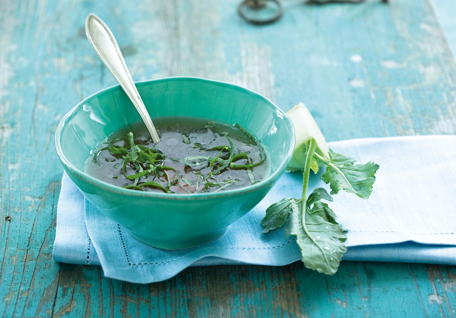 Gemüsebrühe erhitzen, fein geschnittene Blätter dazugeben, einige Minuten ziehen lassen und würzen. So werden die wertvollen Blätter der Kohlrabi-Pflanze optimal verwertet. Die Knolle gibt es dann als Rohkost.