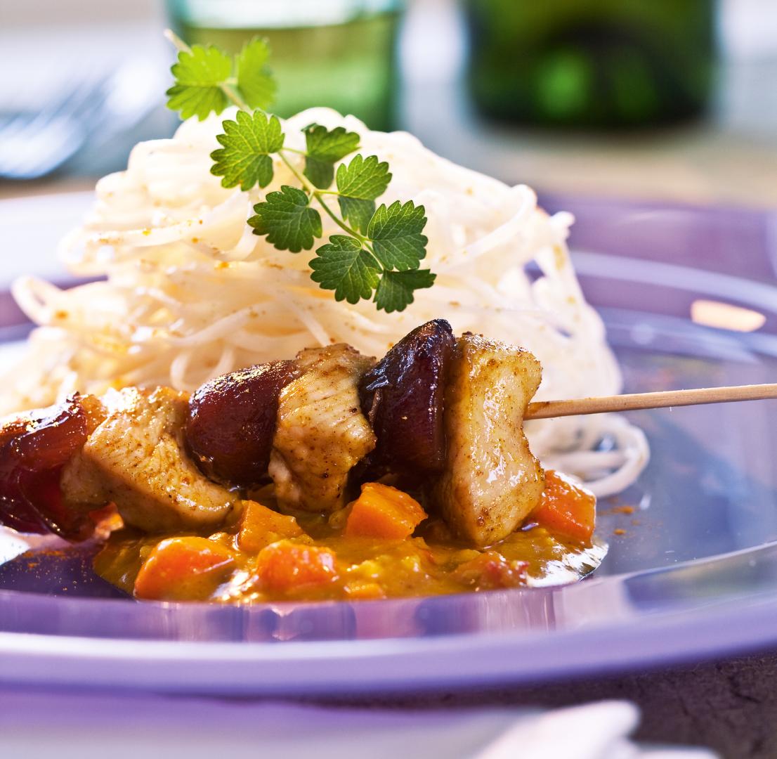 Gewürze mit Sesamöl mischen. Fleisch in kleine Stücke schneiden, in der Würzmischung marinieren. Datteln vierteln. Immer abwechselnd Putenstücke und Dattelstücke auf Holzspieß stecken. Spieße auf ein leicht gefettetes Blech legen. Zusammen mit einer mit Wasser gefüllten feuerfesten Form ca. 20 – 30 Minuten bei 200 °C im Backofen garen. Reisnudeln in Salzwasser 7 – 9 Minuten kochen, kurz abschrecken. Tipp: Ein paar Tropfen Öl ins kochende Wasser verhindern das Kleben der Nudeln. Curry-Sauce erhitzen. Alles zusammen auf Tellern anrichten.