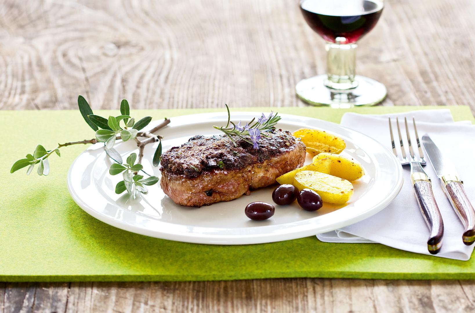 Für die Kruste Toastbrot fein mahlen. Mit Butter und Tapenade vermengen. Eventuell salzen. Masse auf die gewürzten Steaks streichen. Von jeder Seite 2 Minuten grillen.