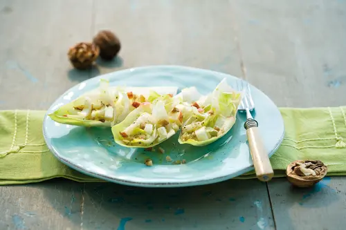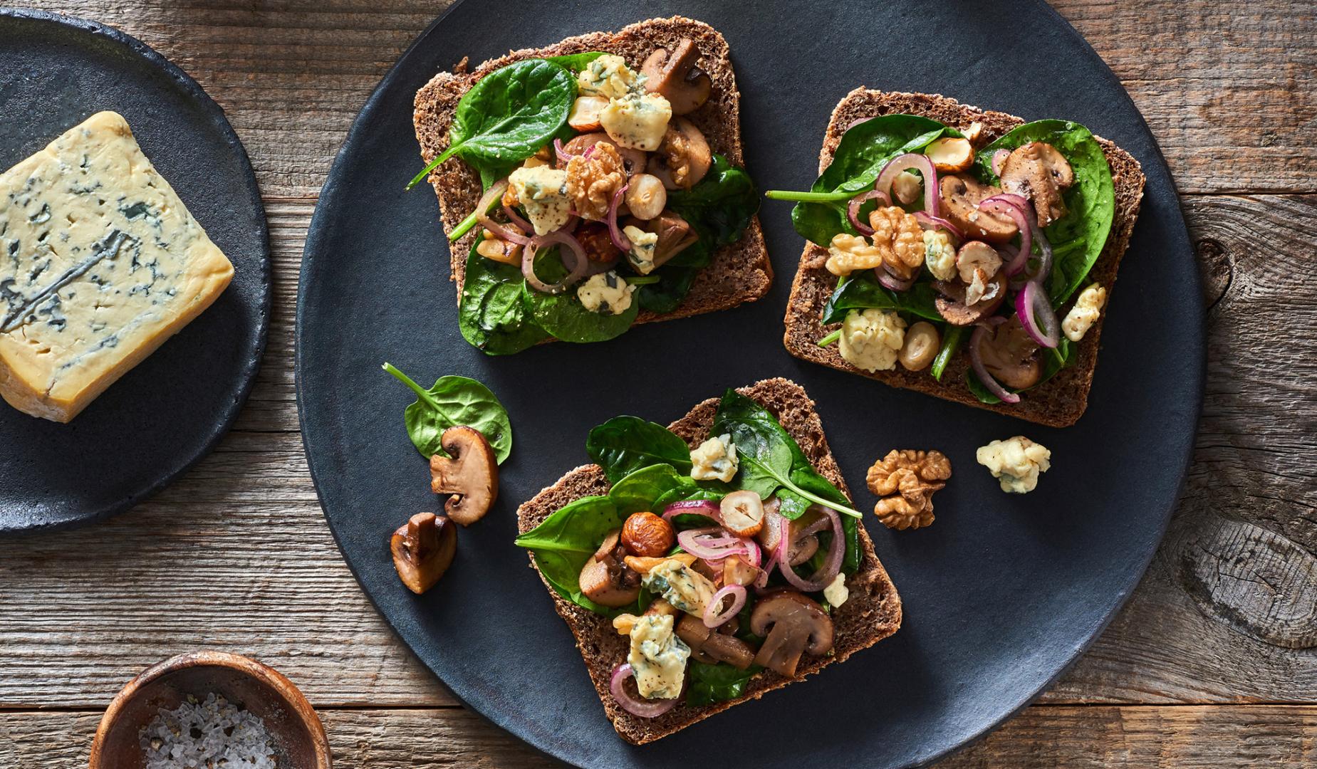 Champignons halbieren, im Öl anbraten und etwas Salz und Pfeffer dazugeben. Nüsse rösten – ohne Öl in einer trockenen, heißen Pfanne –, eventuell einmal durchhacken.Rote Zwiebel in ganz feine Ringe schneiden und mit dem Spinat, den Champignons und den Nüssen mischen. Die noch lauwarme Mischung auf die Roggenbrotscheiben geben und mit kleinen Käsestücken belegen.